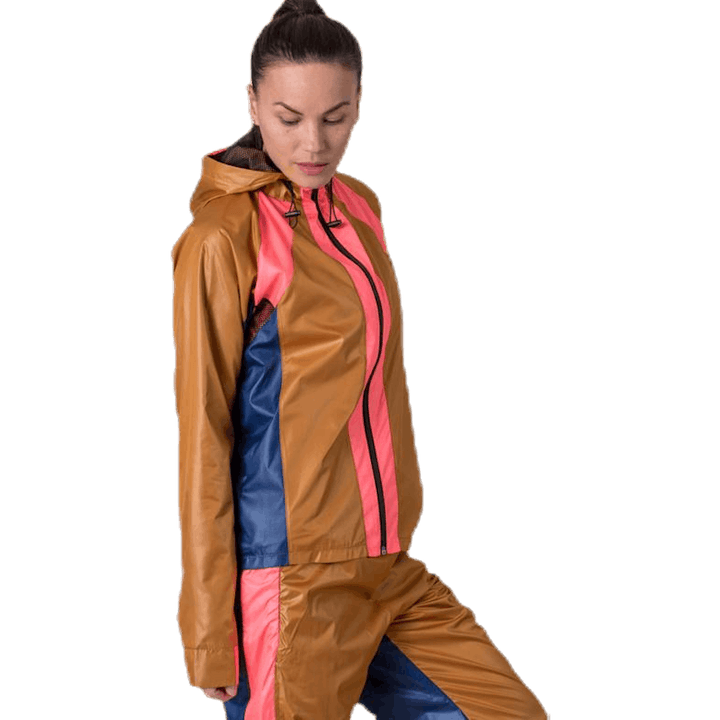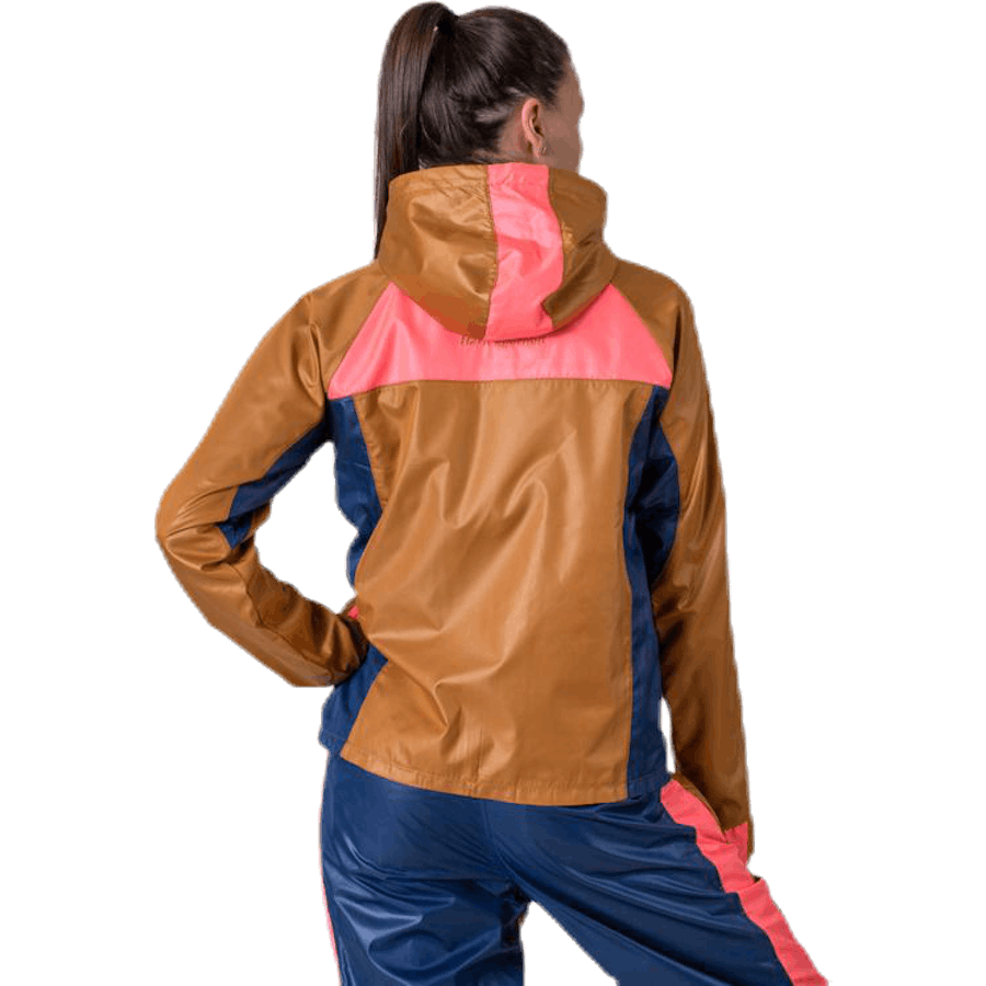 Sporty jacket with caramel, neon pink and blue details. The jacket has a mesh lined hood with elastic drawstring.