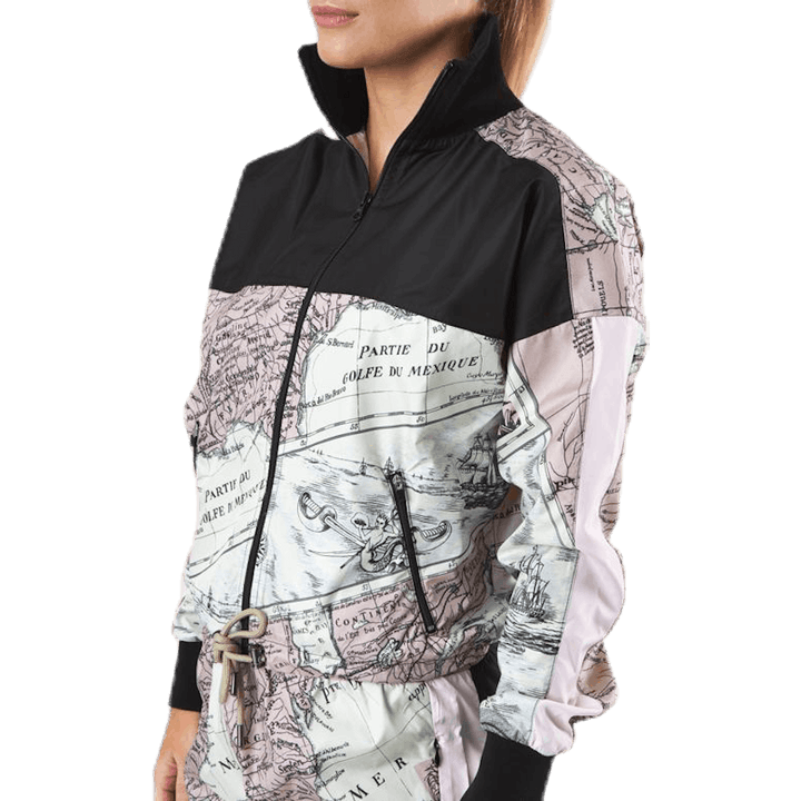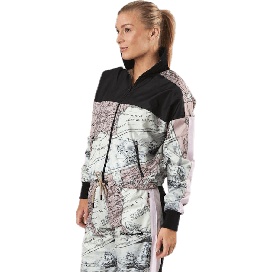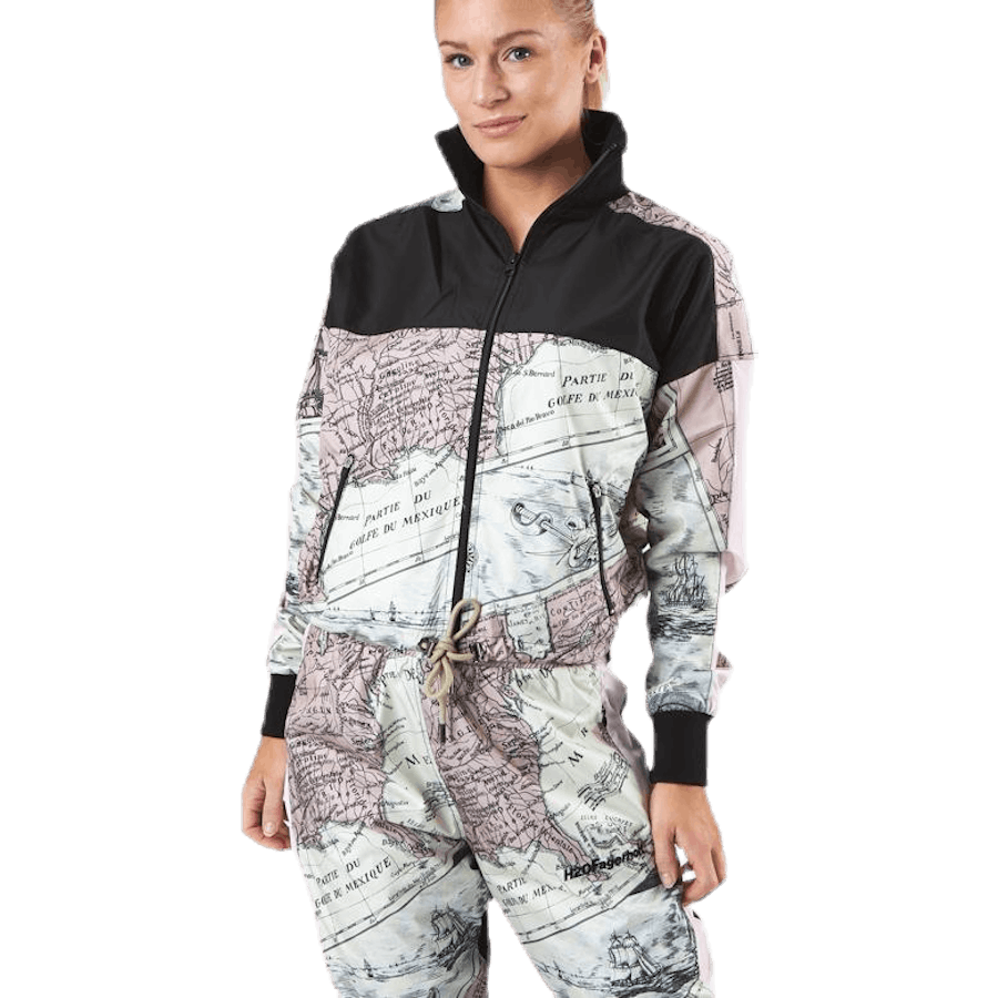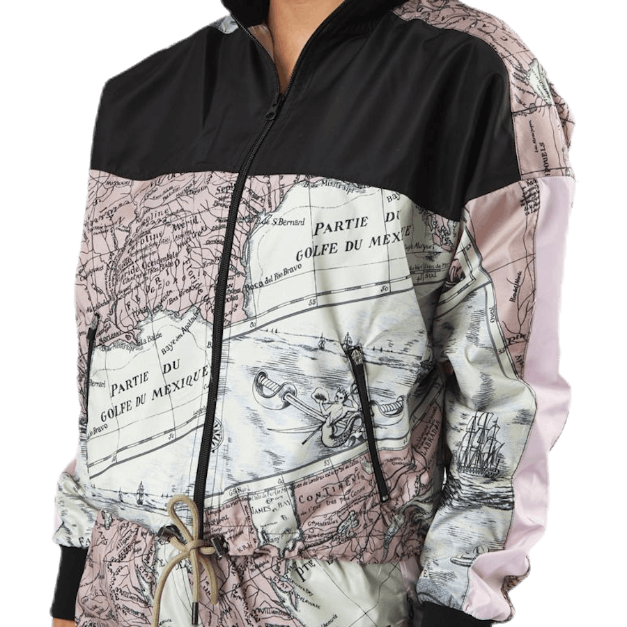 Stylish and comfortable jacket with all over map print. Front zipper and adjustable hem
