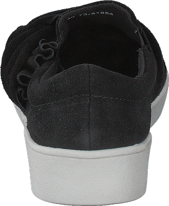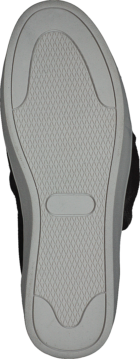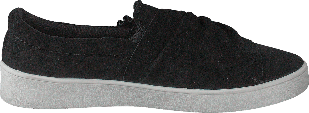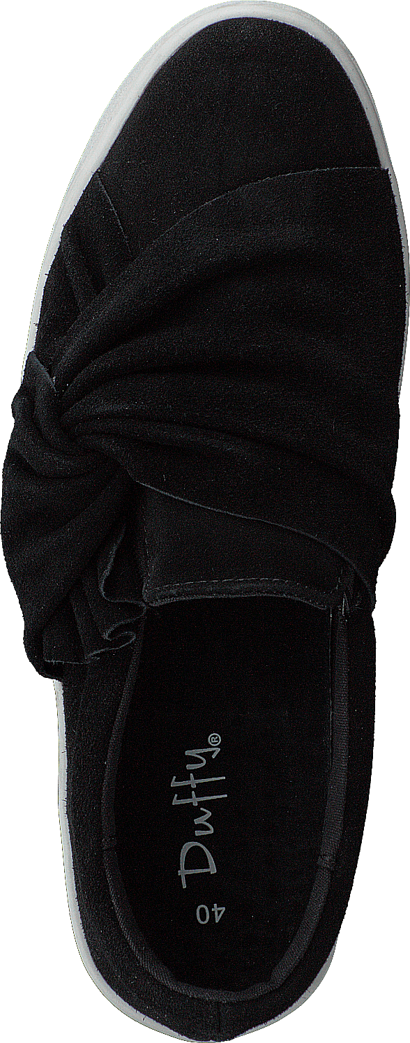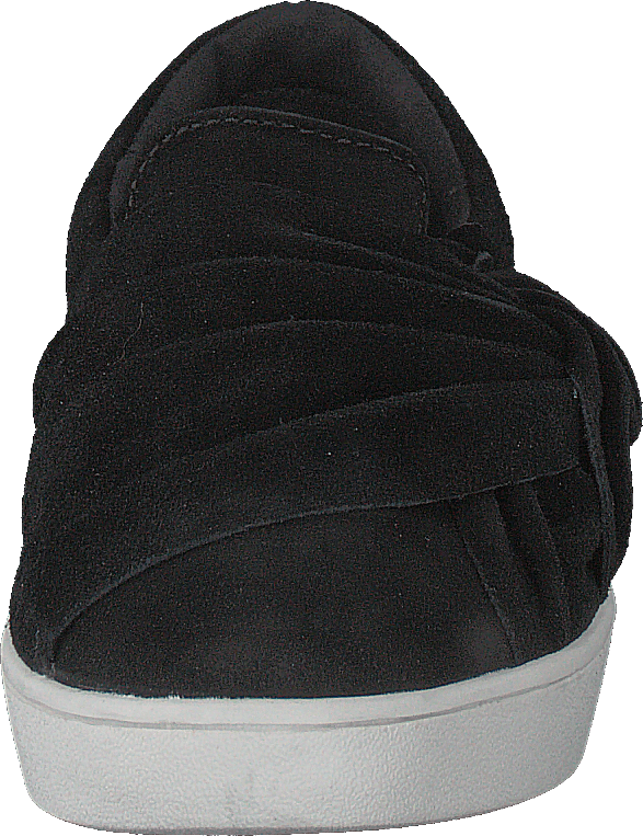 Elegante modelo slip-on negro en ante y suela plana blanca. Nudo decorativo en la parte superior.