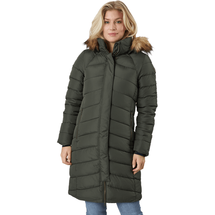 Lämmittävä talvitakki kierrätetyllä päällikankaalla, joka on myös vettä hylkivä. Takki on pehmustettu untuvajäljitelmällä ja imartelevalla hieman pidemmällä mallillaan se pitää suuremman osan vartalosta lämpimänä. Tyylikäs naisten talvitakki, joka pitää sinut lämpimänä kylminä talvikuukausina. Tamara-takin huppu ja tekoturkikset ovat molemmat irrotettavia, ne lisäävät hienon yksityiskohdan, jota voi vaihdella. Toimivilla vetoketjullisilla etutaskuilla ja sisätaskulla pidät arvoesineet paikoillaan. Takin hihansuissa on joustavat hihansuut, jotka estävät tuulen ja kylmän pääsyn läpi.