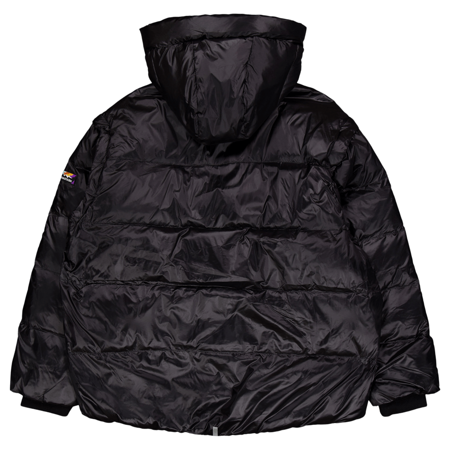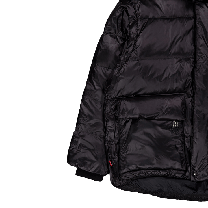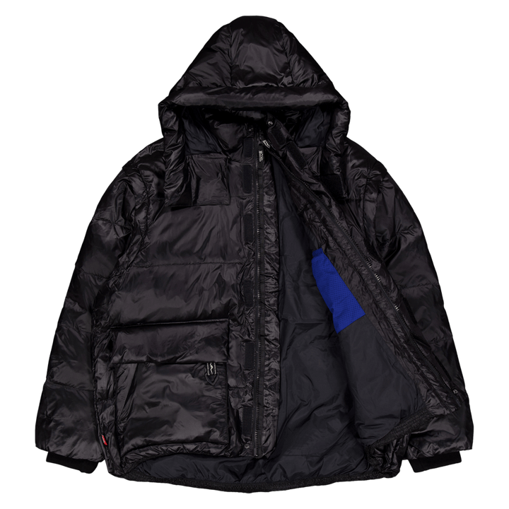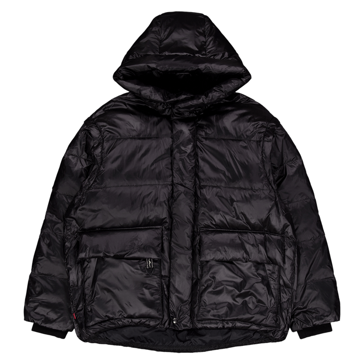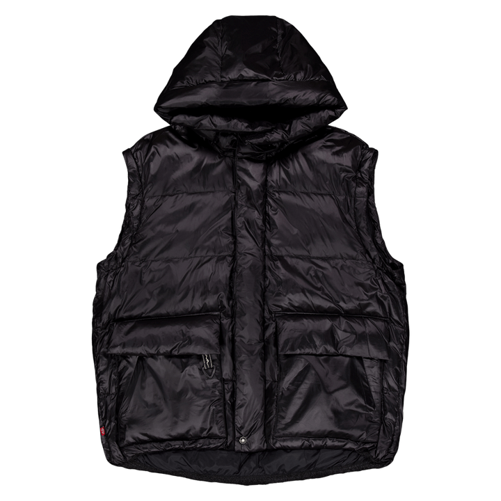 Doudoune garnie de duvet 100% recyclé. La capuche et les manches sont amovibles, ce qui rend l'article portable de 4 manières différentes. Vu ici en noir.