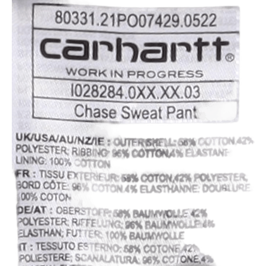 Parte del programma Chase che si concentra sui capi base in jersey, i pantaloni della tuta Chase sono realizzati in tessuto pesante di cotone e poliestere ed sono stati spazzolati per conferirgli un supporto simile al pile. Il capo ha una vestibilità ampia ed è dettagliato con inserto inguinale, vita regolabile e polsini elasticizzati. Un logo Carhartt WIP "C" ricamato appare sulla manica sinistra.