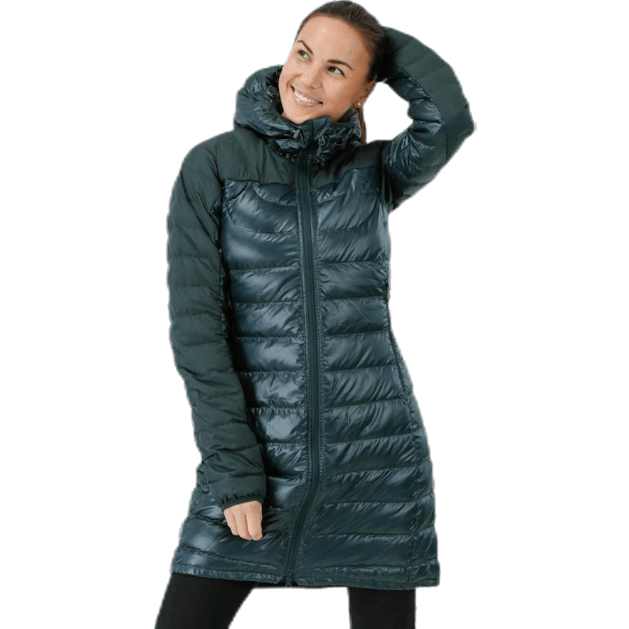 Quiltad lång och varm modell med huva. Denna lätta parkas tar liten plats i packningen och är lätt att bära med sig och lätt att ta ut om kylan slår till. Den är också varm och skön att ha på sig hela dagen. Dun och yttermaterial har behandlats med fluorkarbonfri DWR som skyddar mot väder och vind och minimerar materialens vätskeupptagning.