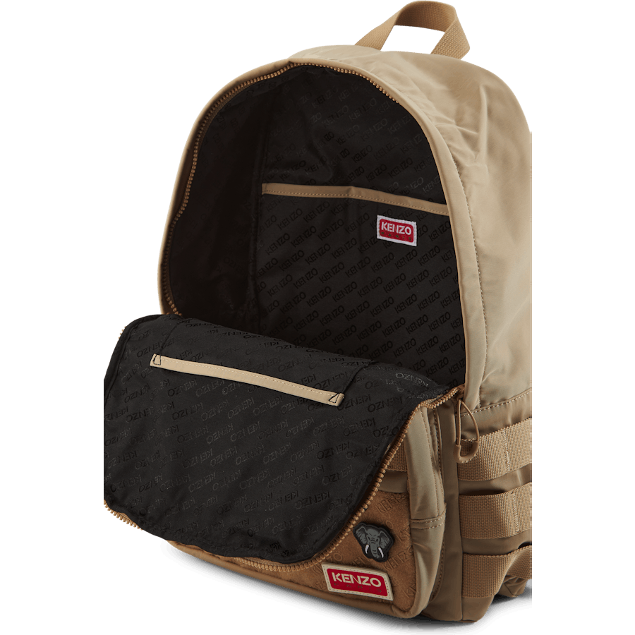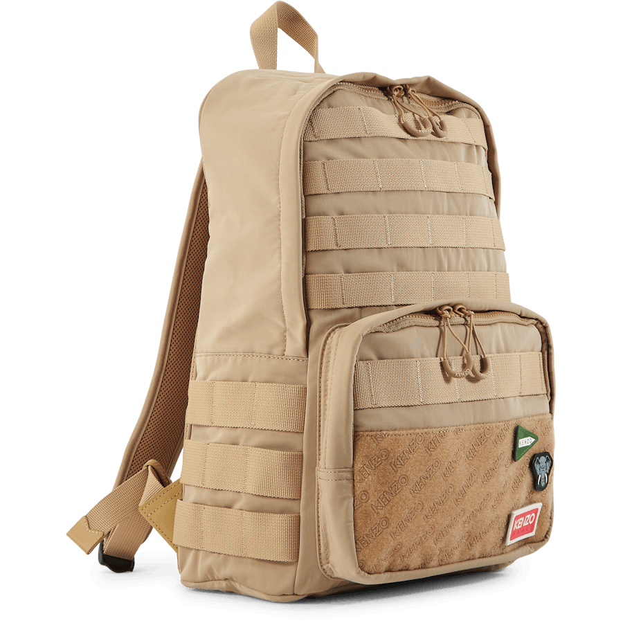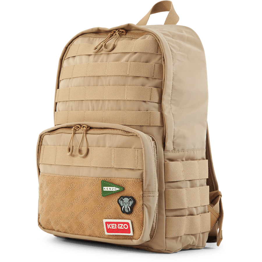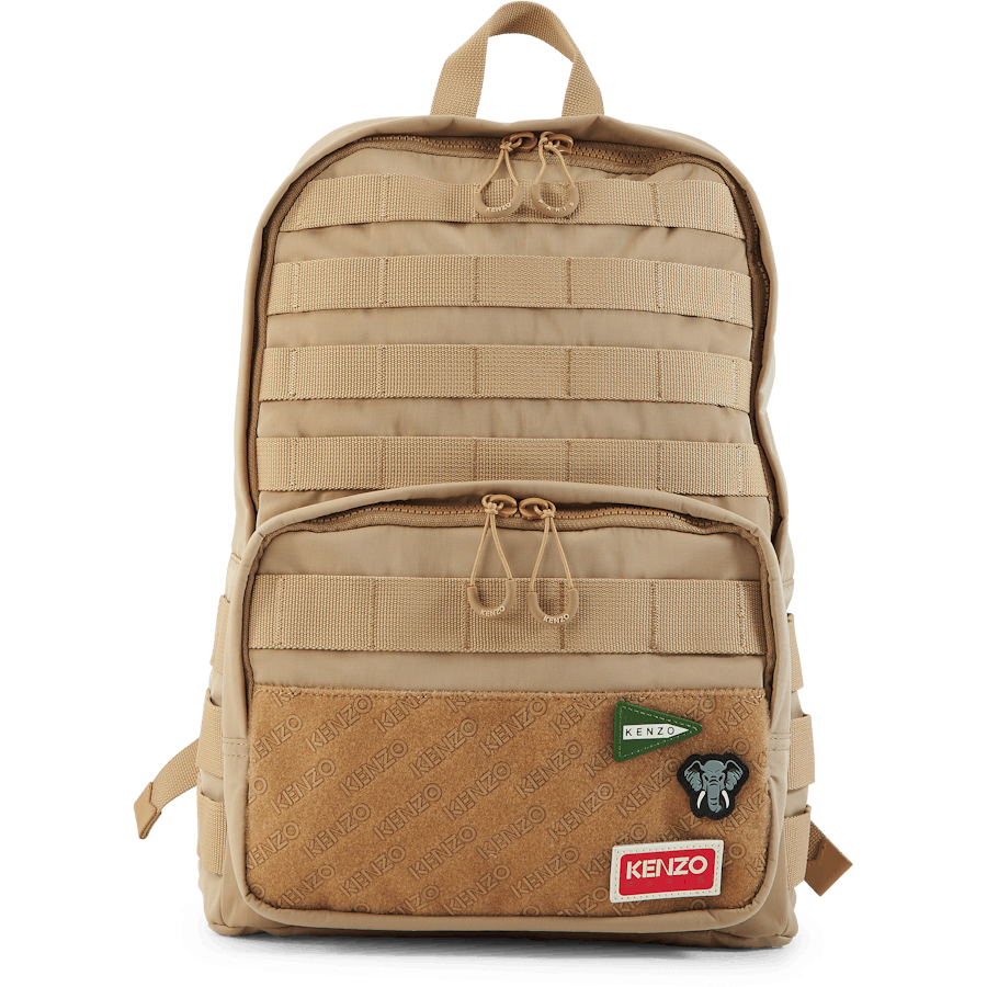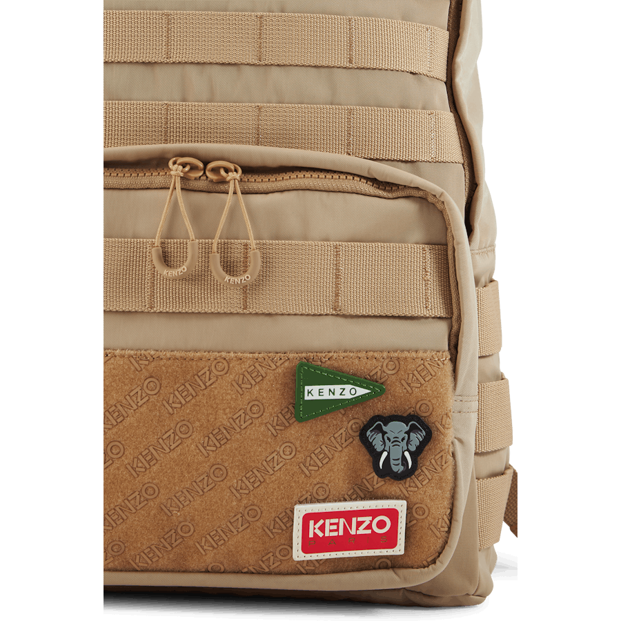 Tento batoh s popruhmi evokuje obľúbené zviera Kenza Takadu s odznakom slona. Ostatné odnímateľné odznaky predstavujú rôzne vzory loga KENZO. Je vylepšený ozdobnými pásikmi pre extra originalitu.